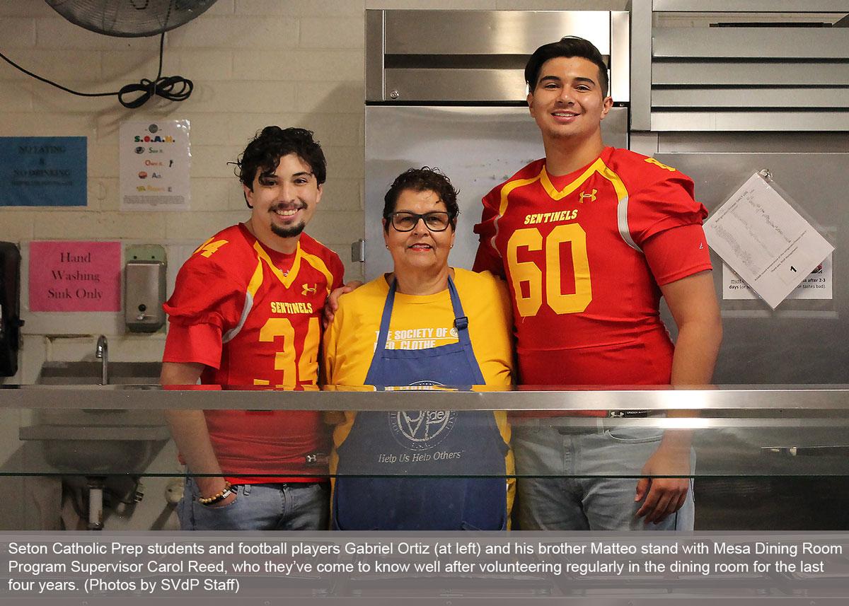 Behind the serving stations at St. Vincent de Paul’s Mesa Dining Room, guests will frequently encounter a pair of athlete brothers, dishing up lunch or hauling boxes of food. Gabriel, 18, and Matteo Ortiz, 16, have made volunteering at the dining room part of their regular routine.